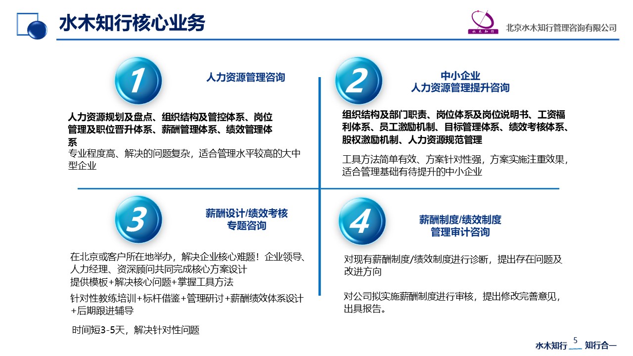 北京水木知行管理咨詢有限公司(www.bjsmzx_com.fzssjj.com)專注提供人力資源管理咨詢、人力資源管理培訓、人力資源招聘咨詢、人力資源獵頭服務業務;咨詢業務范圍包括組織結構與管控體系、崗位管理體系、薪酬管理體系、績效管理體系,咨詢形式包括全過程咨詢、教練式咨詢和特訓班;培訓業務包括企業基礎管理...[詳情]